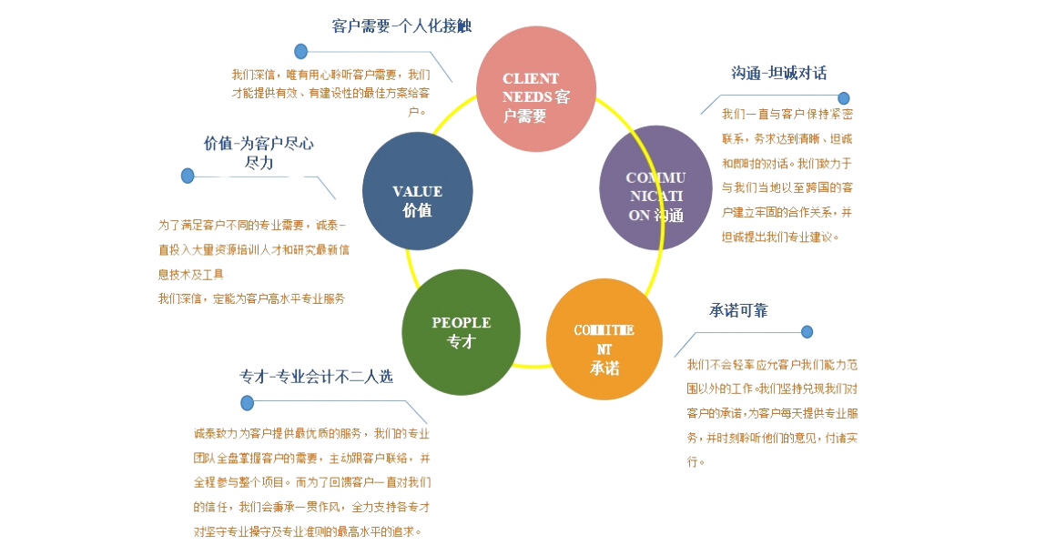 我们的专业团队由注册会计师、税务师、资产评估 师组成,经验丰富,对各行各业有深厚的认识,并掌握商业社会的最 新动态,时刻与客户保持紧密沟通。我们从客户的角度出发,细心聆 听,明白客户需要,从而提供客户的专业意见。我们不断检讨我们自 己的服务素质,以求保持优质的专业服务。诚泰多年来赢得客户的信 赖,不仅因为我们对本地市场了解透澈,恪守高水平的专业准则,更 因为我们拥有坚持为客户提供切合需要的服务决心。
